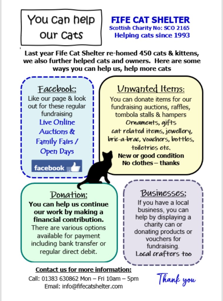 If you can get in touch directly with Fife Cat Shelter by emailing info@fifecatshelter.com thank you!